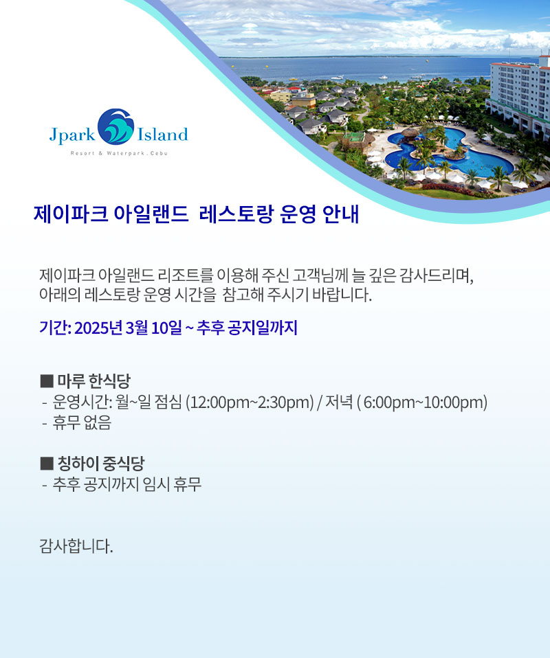 제이파크 아일랜드 레스토랑 운영 변경 안내