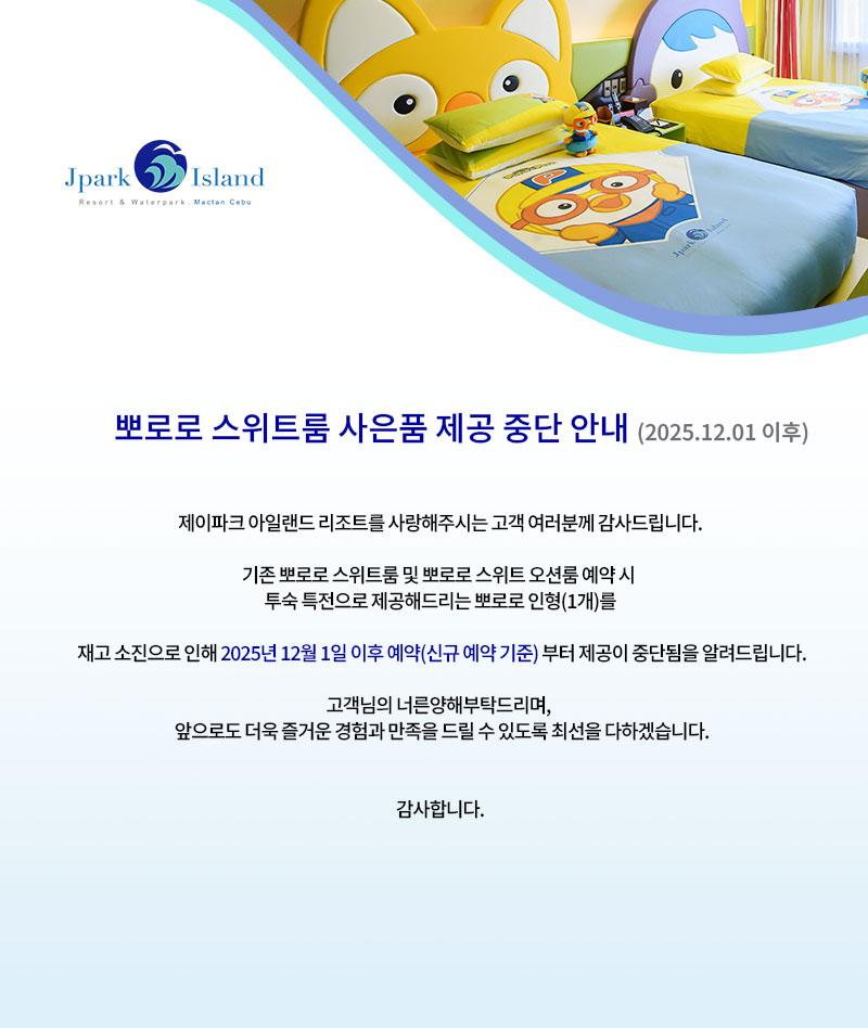 뽀로로 스위트룸/뽀로로스위트오션룸 사은품 중단 안내