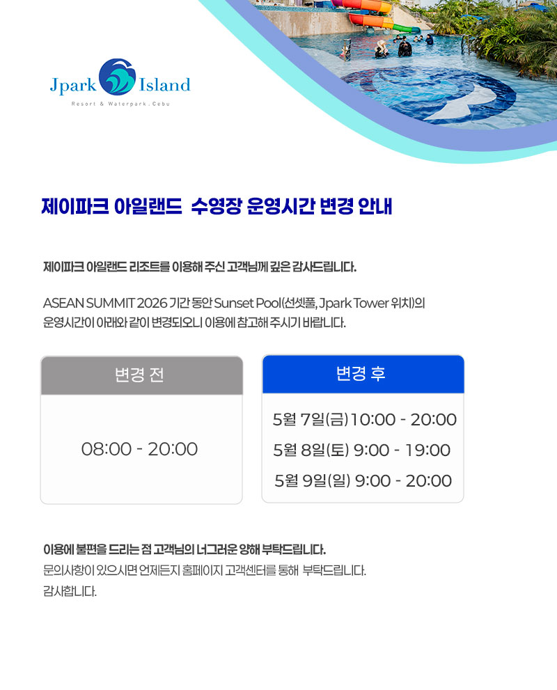제이파크 아일랜드 선셋풀 운영시간 변경 안내 (5.7-5.9)