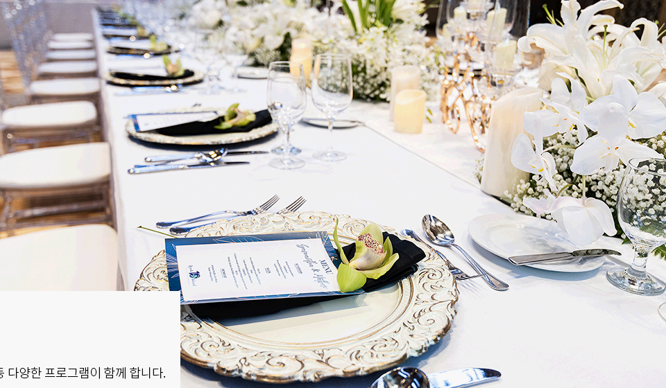 • 웨딩 시간은 4시간 기준 • 하객 대기 공간에 각종 음료비치 • 아름다운 웨딩 플라워 데코레이션 • 최고의 웨딩을 위한 음향 및 조명 설비 |